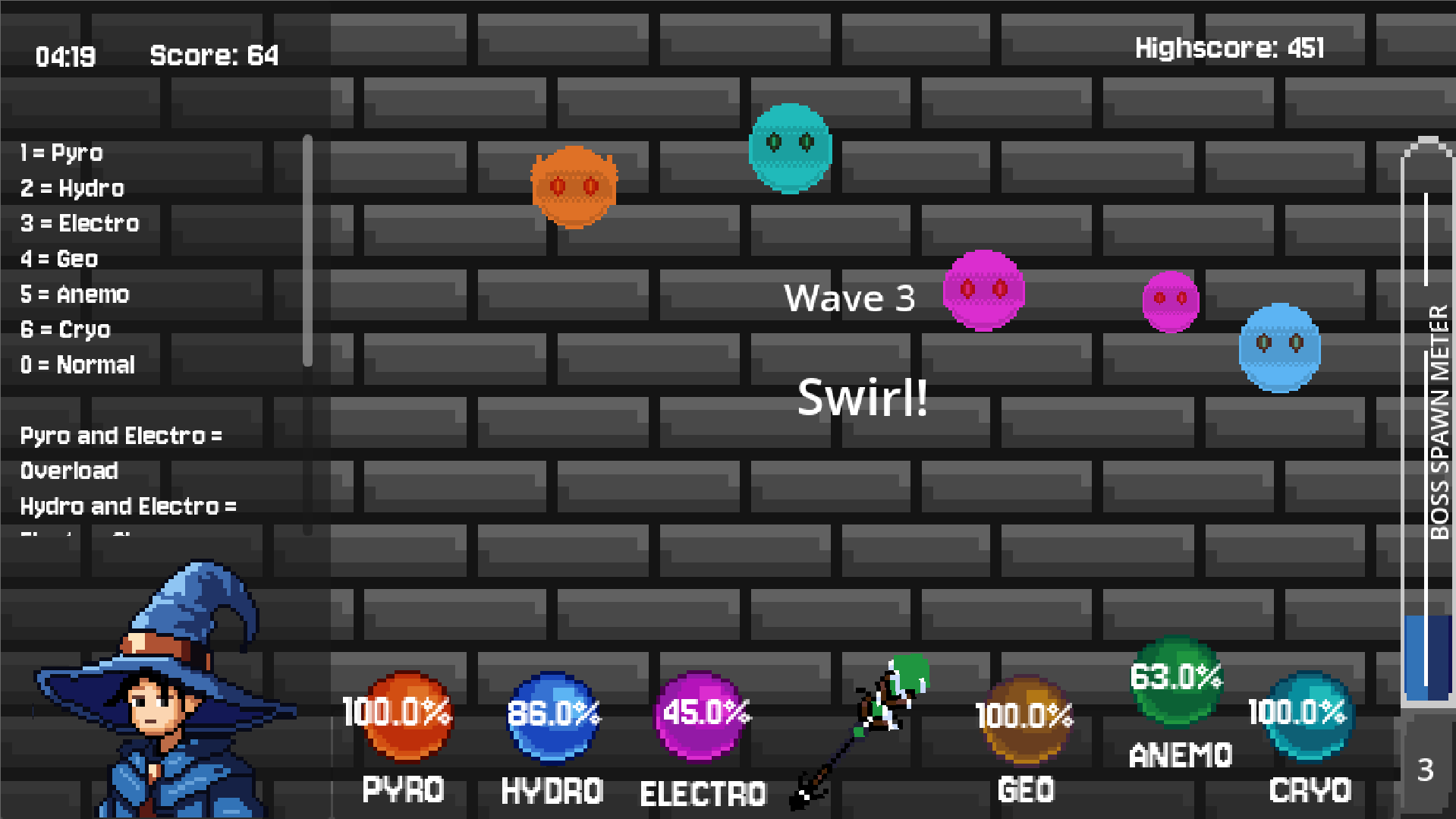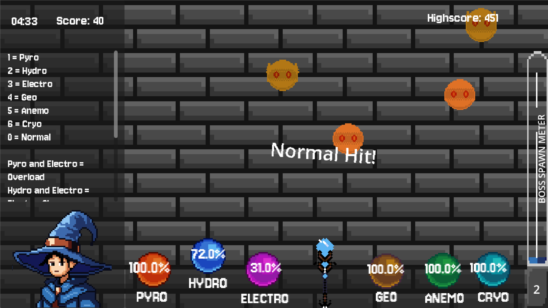 You are a mage wielding a powerful staff capable of shooting different elemental orbs. Combine elements, trigger powerful reactions, manage your energy wisely, and eliminate waves of enemies before they overwhelm you.